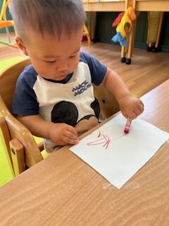 2人のお子さんの同じ作品作りですが、1人のお子さんはクレヨンかきかき
