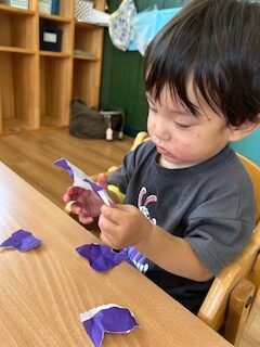 先生が「今日は折り紙でやるよ」と決め、お子さんが折り紙嫌だな・・・と言葉では言わず表情や行動で嫌さが表れていたとしても、手取り足取り先生がやってしまえば完成する作品も、こうやって1人ひとりの気持ちを尊重し、自分がやりたい物を選択する、やりたい気持ちを待つ、その結果最終的に2人が同じ作品を作り上げることができました。