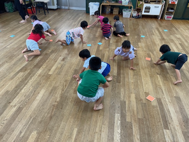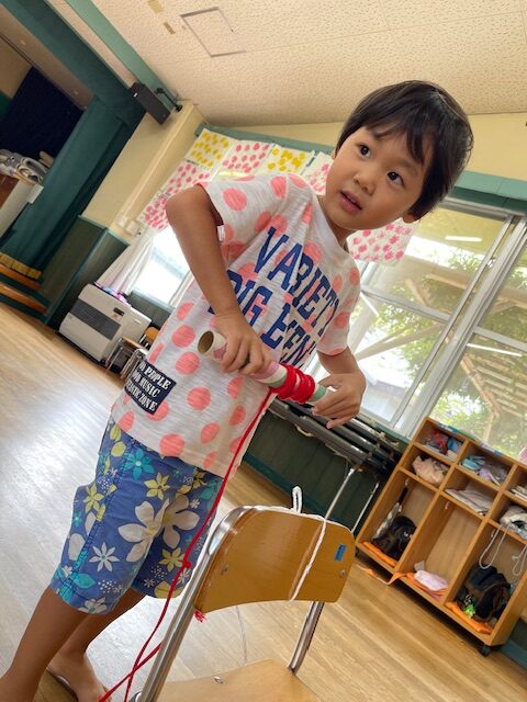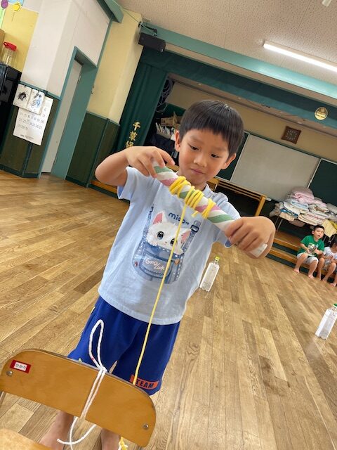 紐をくるくる巻き上げ、どちらが早く近づけるか、色カードめくり・・・と様々なお子さんが楽しめる内容が盛りだくさん。