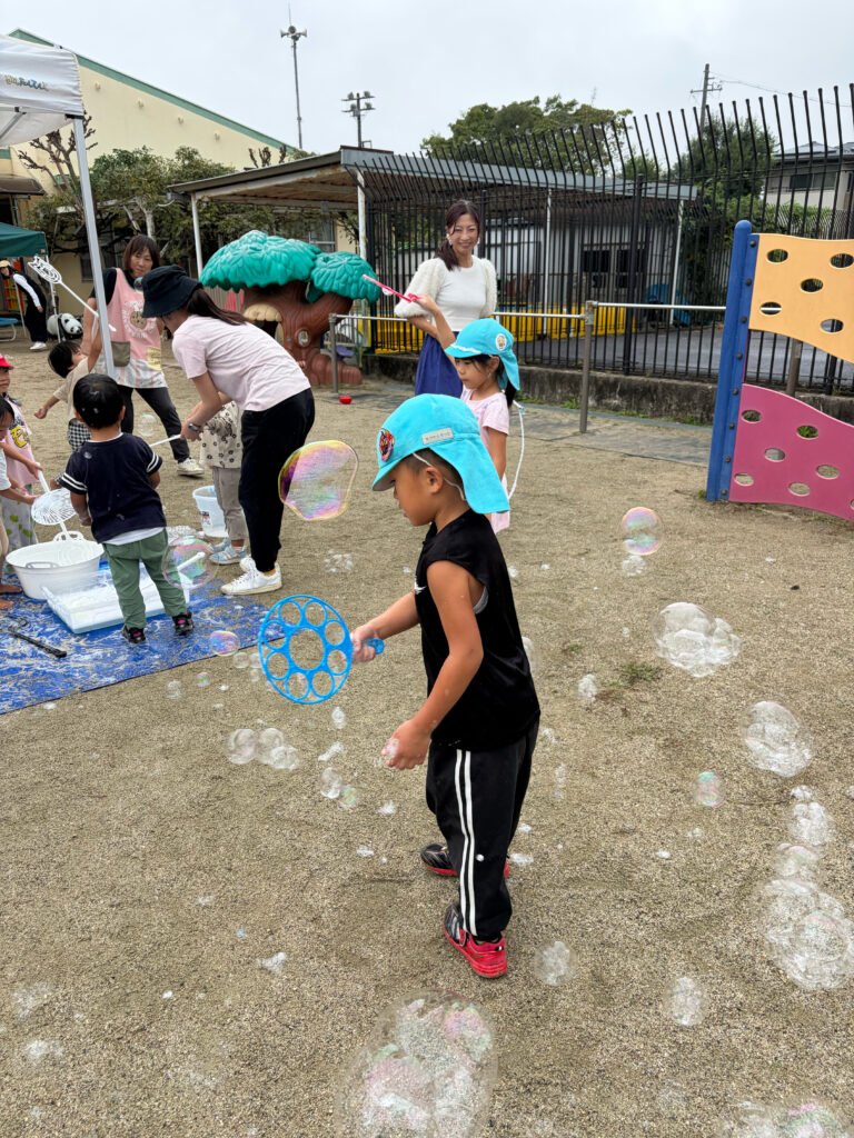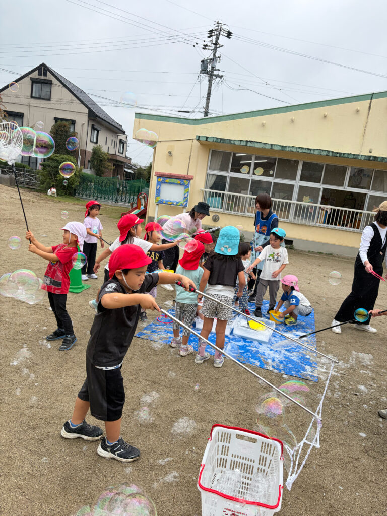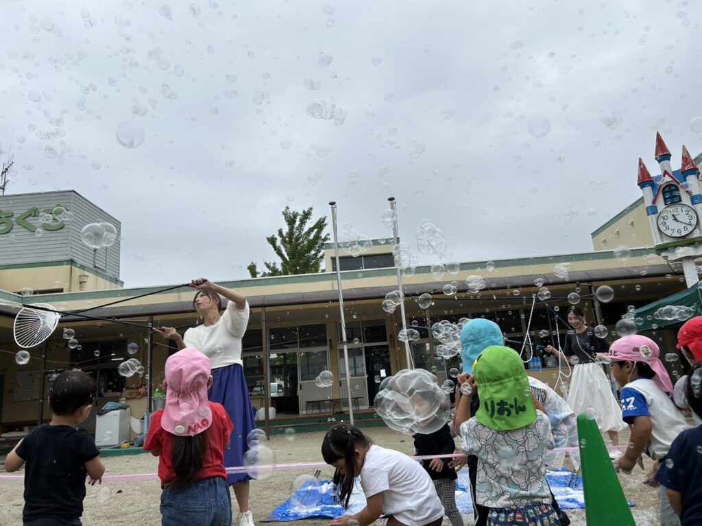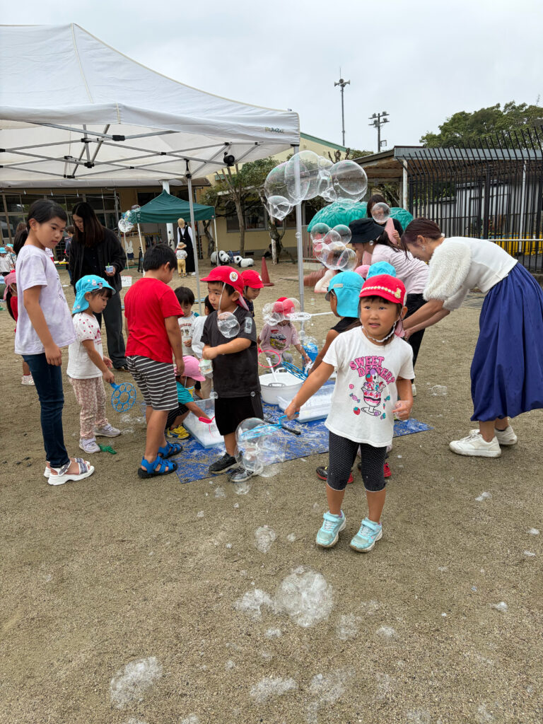 子どもたちは夢中になって追いかけたり、ふわりと浮かぶ泡にうっとりしたり…感性がぐんぐん育つ時間でした。