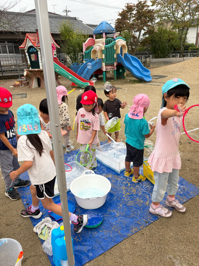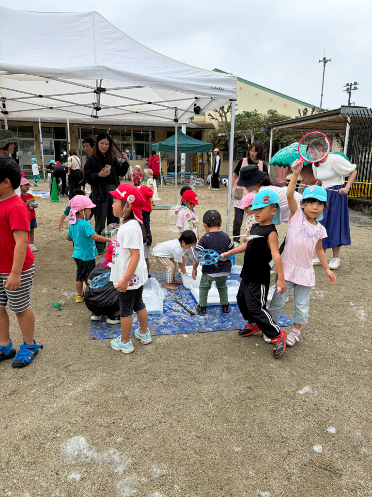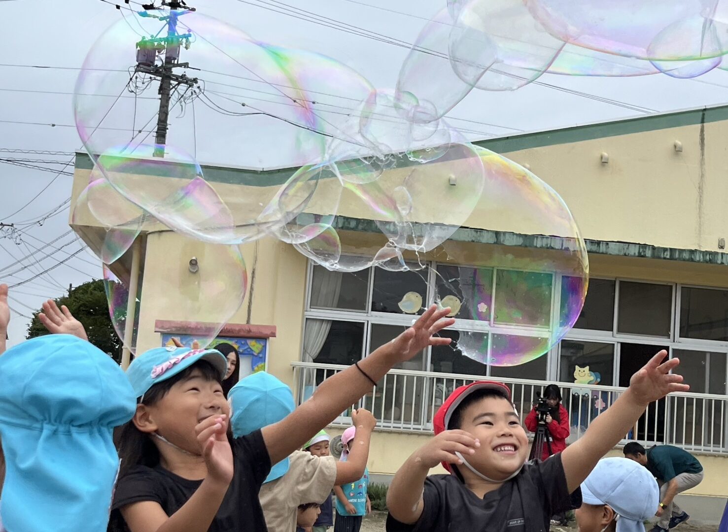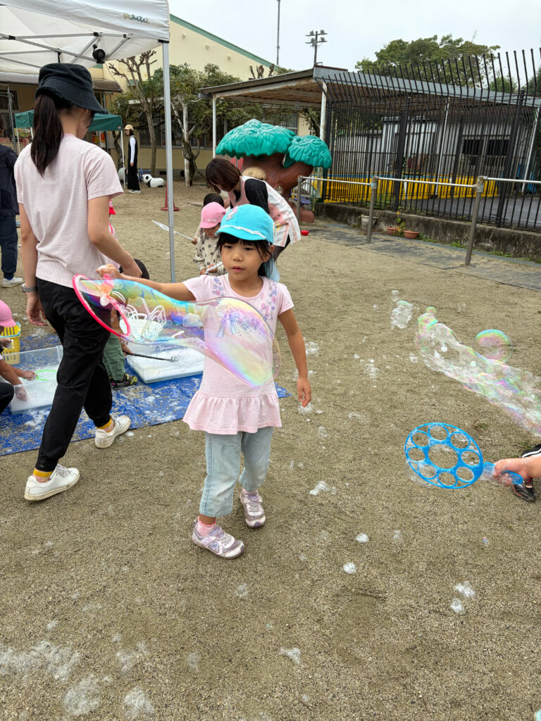 子どもたちは夢中になって追いかけたり、ふわりと浮かぶ泡にうっとりしたり…感性がぐんぐん育つ時間でした。