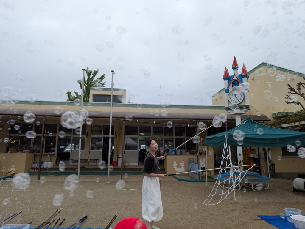 幻想的な光の中で、シャボン玉が描く一瞬のアートに、子どもたちの笑顔があふれました。空を見上げる瞳には、驚きと喜びがいっぱい。まるで夢の世界に迷い込んだような、心に残るひとときとなりました。
