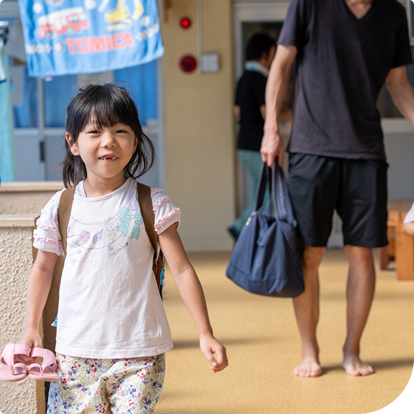みんなで帰りの会を行います。お迎えの時間になった子から、先生と一緒に「さようなら」のごあいさつ。「またあしたね!」と笑顔で手を振りながら帰っていきます。一日を安心して過ごし、心も体も満たされた表情でおうちの人に抱っこされます。
