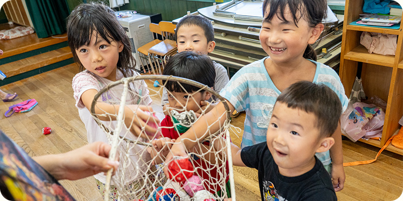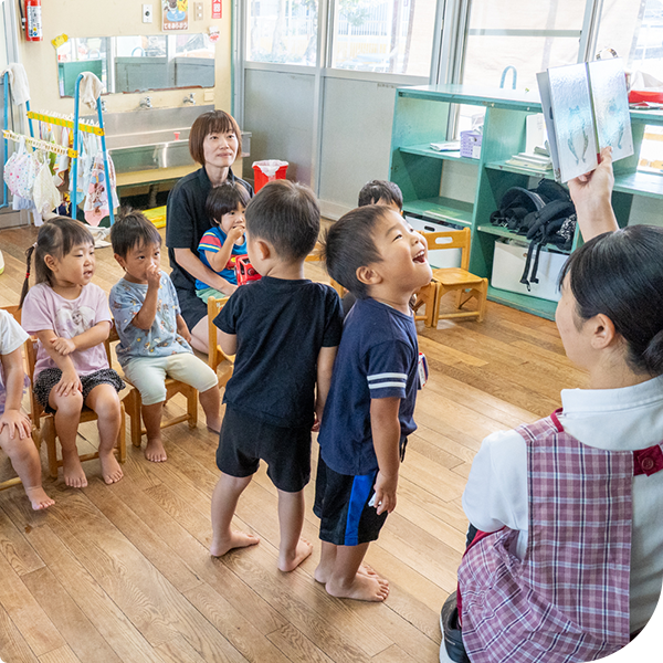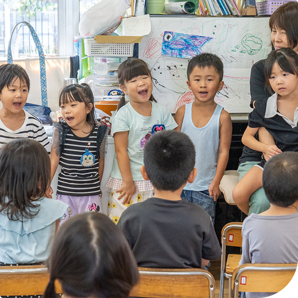 園児が毎日交代でお当番さんを担当します。元気にあいさつした後、歌をうたったり絵本を読んだり。そのあとは、年齢に合わせたあそびや製作、外遊びなどを行います。季節の自然や行事に触れながら、のびのびとした体験を重ねていきます。