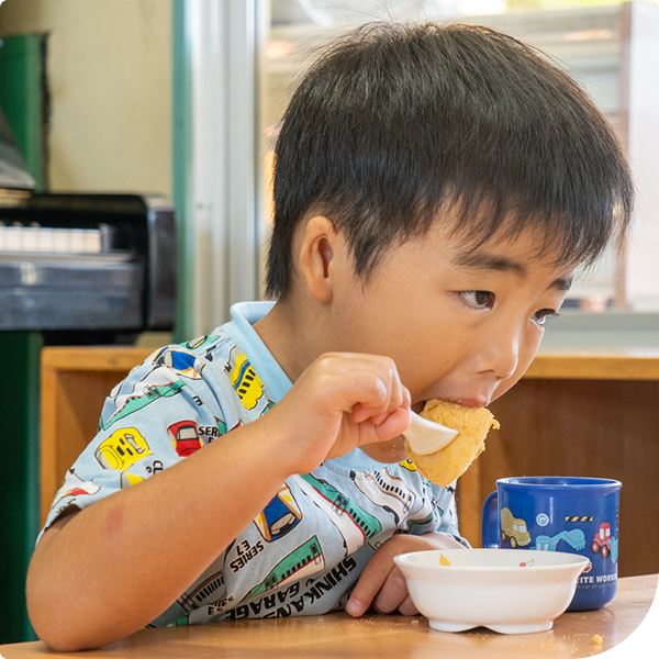 おいしいおやつでほっと一息。「いただきます!」の声とともに、にこにこ笑顔があふれます。午後の活動に向けて元気を取り戻す時間です。
