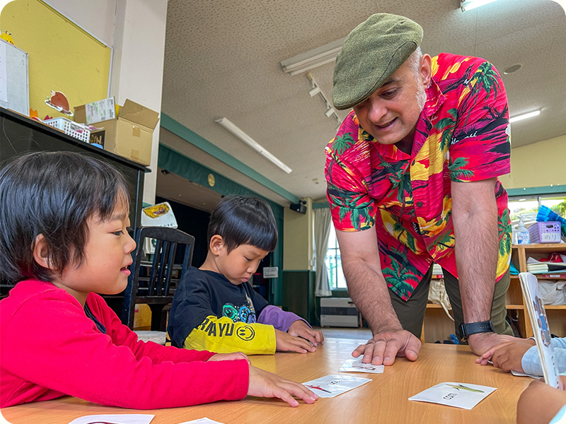 毎週金曜日は、子どもたちが楽しみにしている 英語教室の日。にこにこ笑顔のサム先生(ALT)と一緒に、歌ったり、体を動かしたりしながら、自然に英語にふれています。むずかしい勉強ではなく、「楽しい!」「言ってみたい!」という気持ちを大切にしています。遊びのような時間の中で、子どもたちは少しずつことばの世界を広げています。